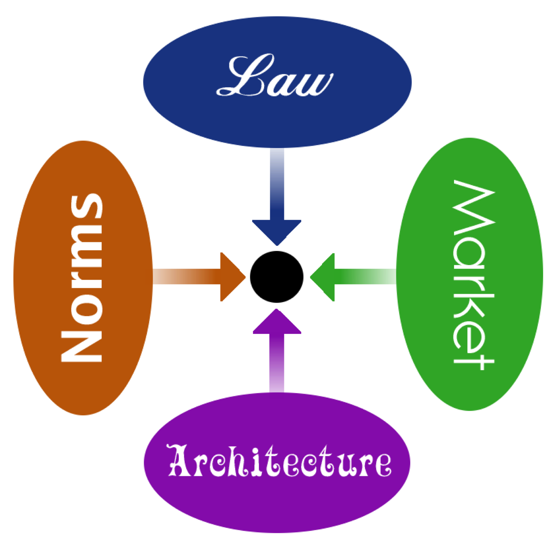 Lessig’s modalities of regulation are the 4 methods of regulating cyber space set out by Lawrence Lessig. These are; Law, Market, Architecture and Norms.
